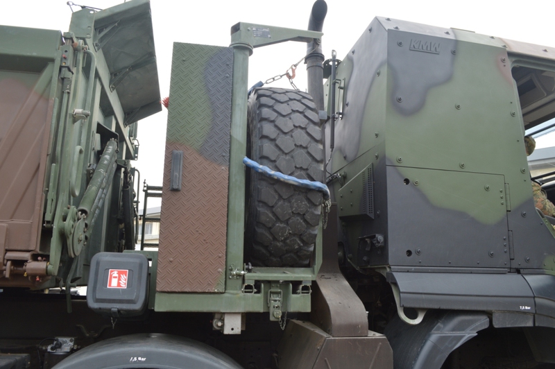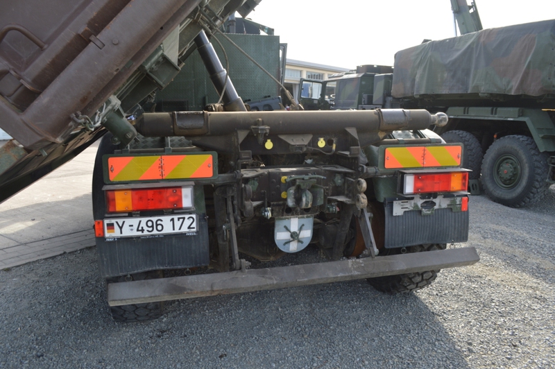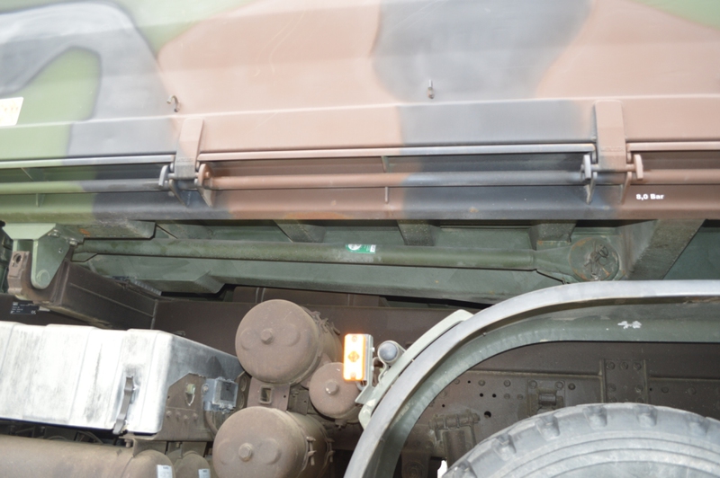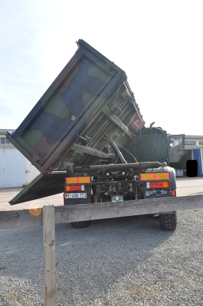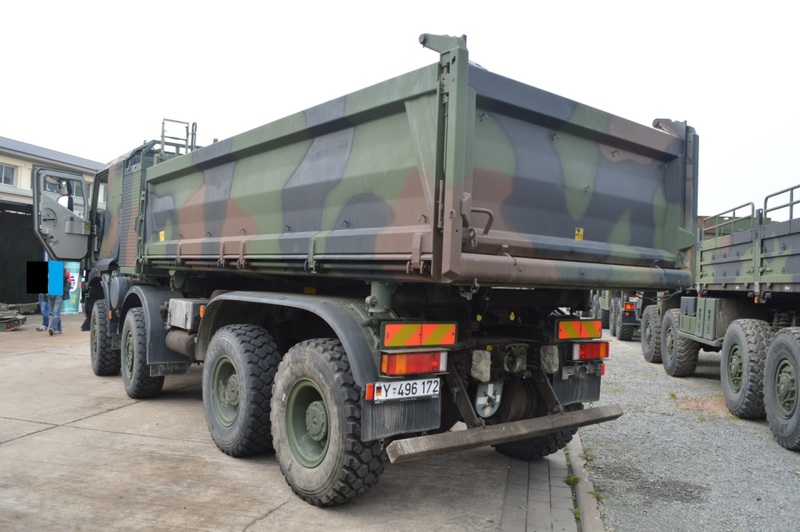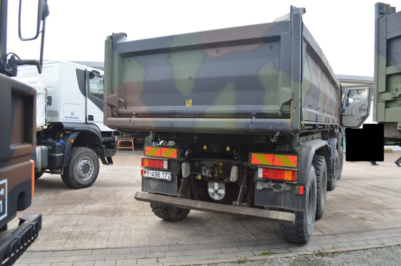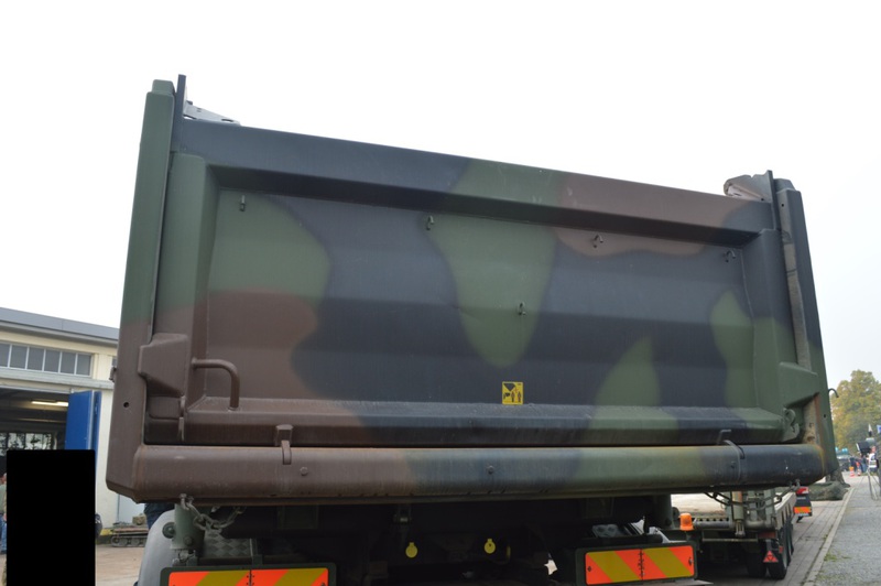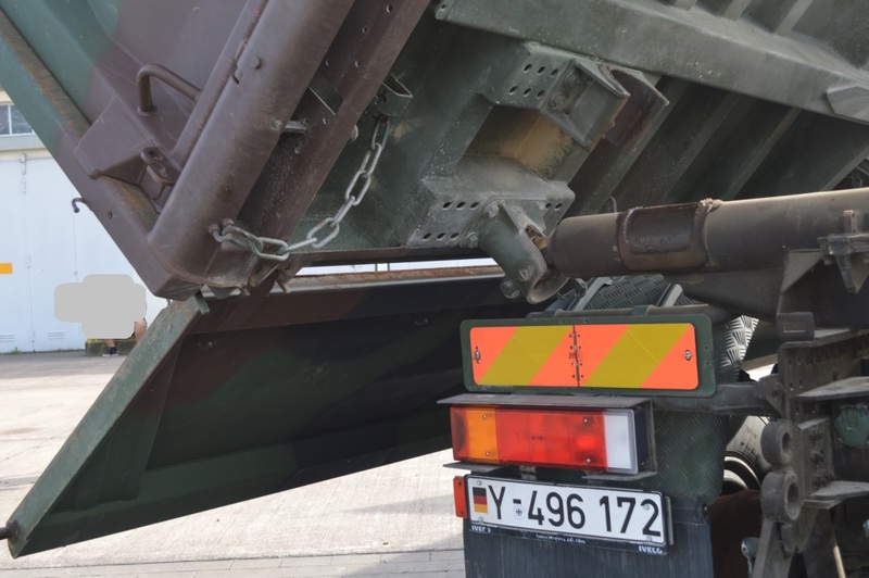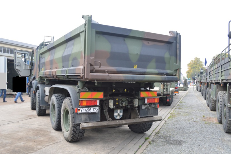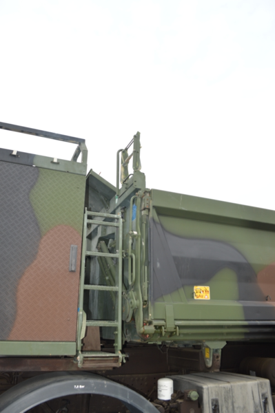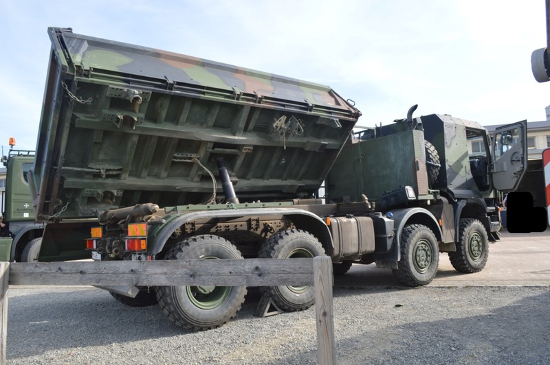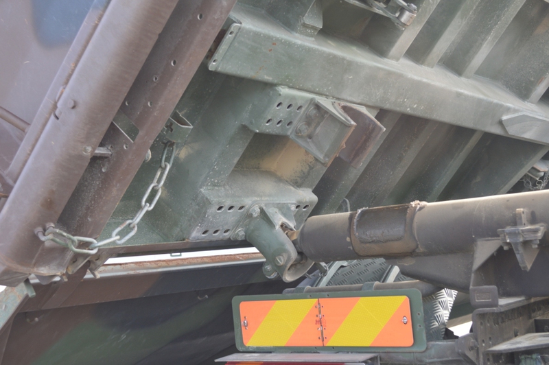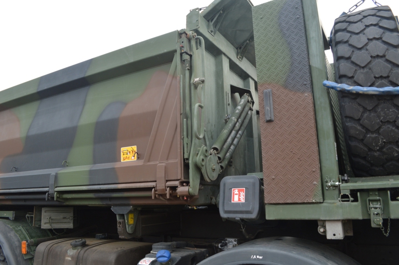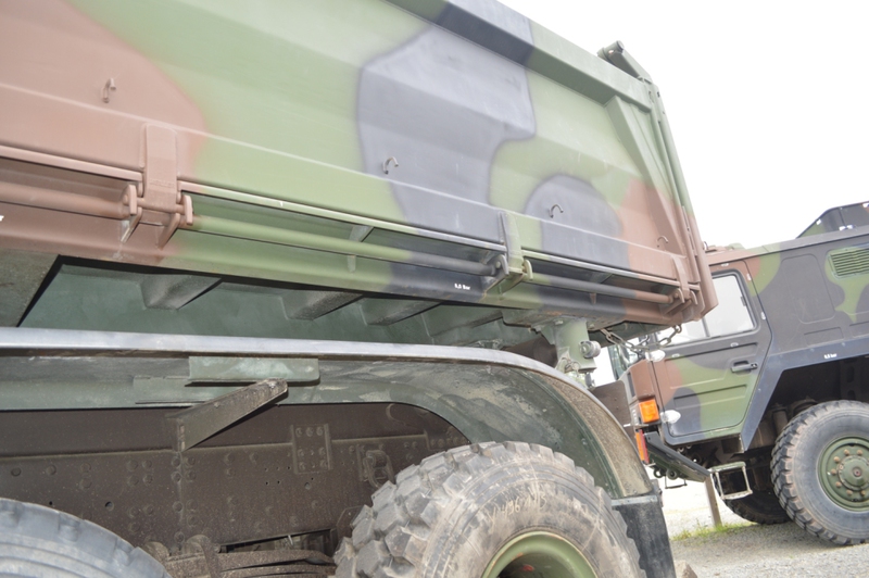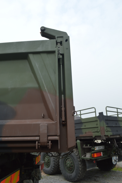 Zum Bau bzw. zur Instandsetzung von Straßen und Plätzen benötigt man in der Regel auch Fahrzeuge die das Baumaterial in loser Schüttung verteilen können. In diese Kategorie fallen auch Dreiseitenkipper! Mit diesen Fahrzeugen kann das Schüttgut (Sand, Kies, Asphalt usw.) neben oder hinter dem Fahrzeug abgeladen werden. Wenn man sich fragt wozu die beiden Ketten unterhalb der Pritsche da sind, damit kann man die hintere Schüttöffnung (die Ketten können an der Heckklappe eingehängt werden) begrenzen und das Schüttgut bei langsamer Fahrt gleichmäßig verteilen. Das erspart beim Straßenbau einiges an Zeit und Arbeit. Die speziellen Einsatzanforderungen der BW machen es leider nötig die Fahrzeuge zum Schutz der Besatzung zu panzern.