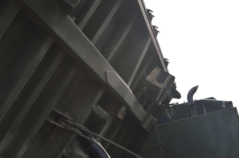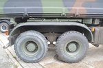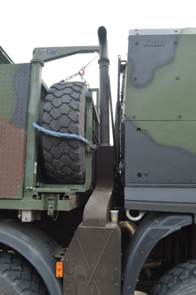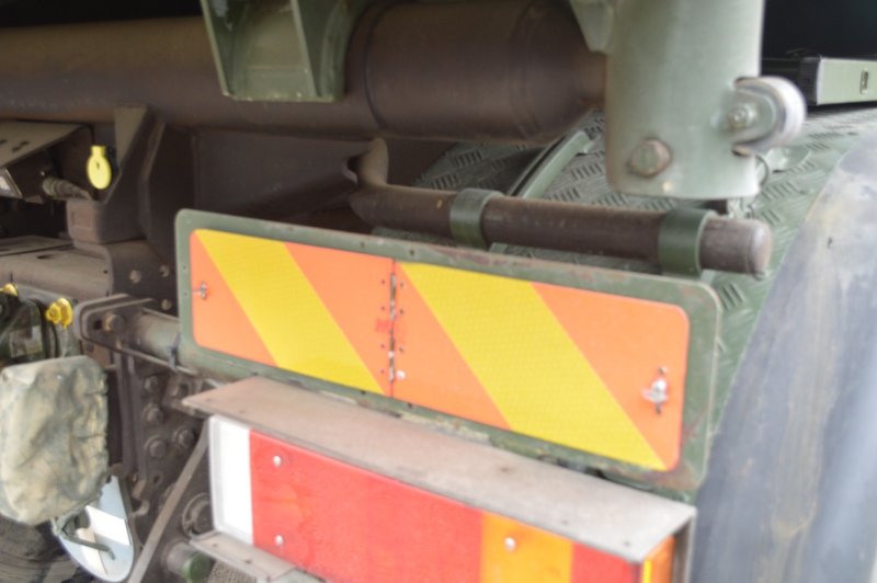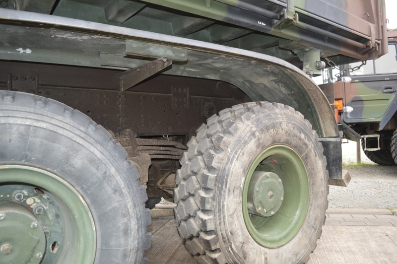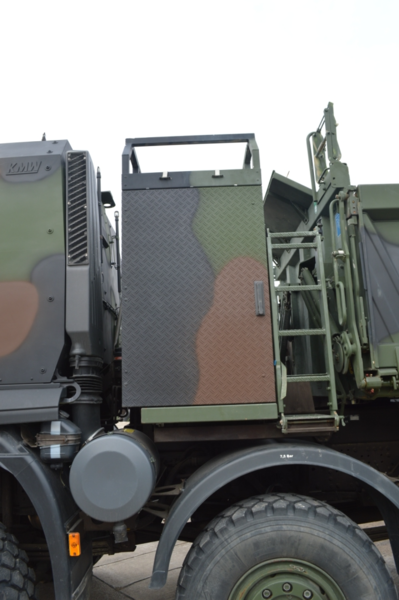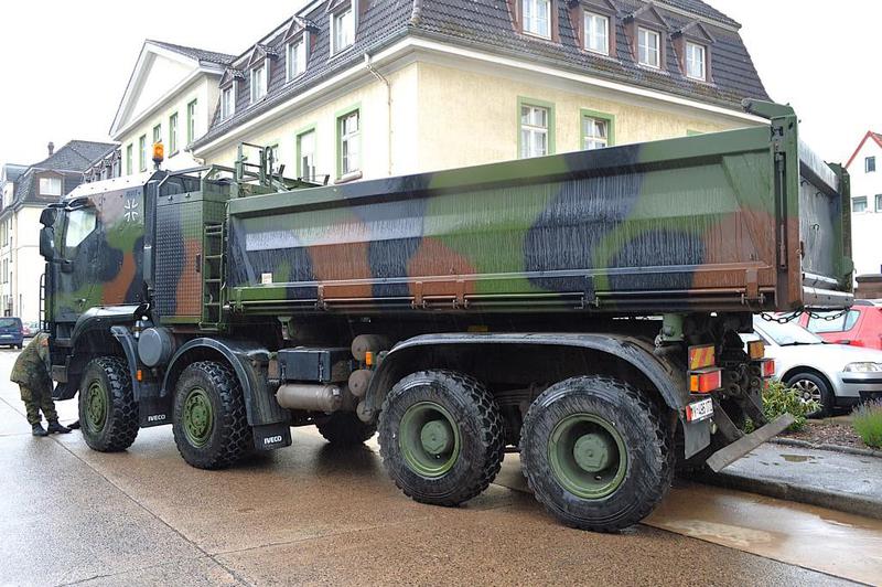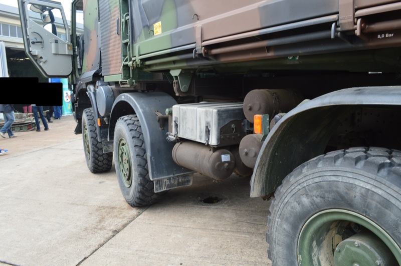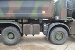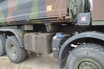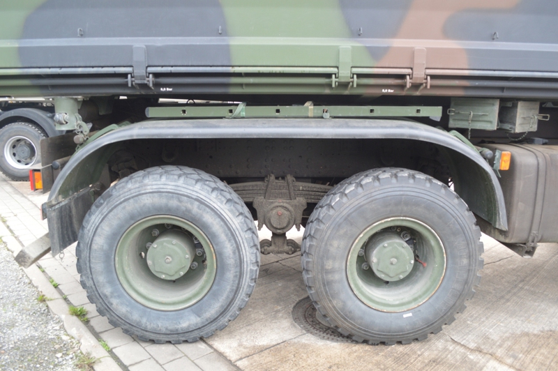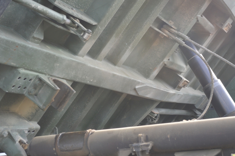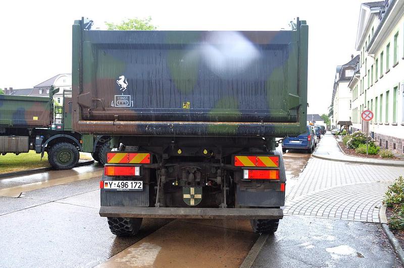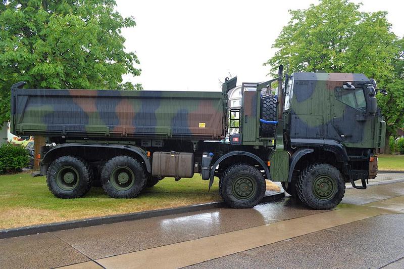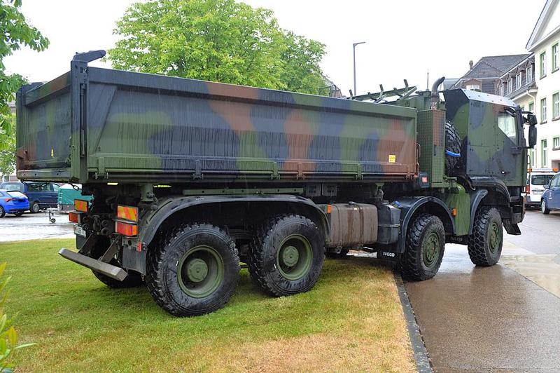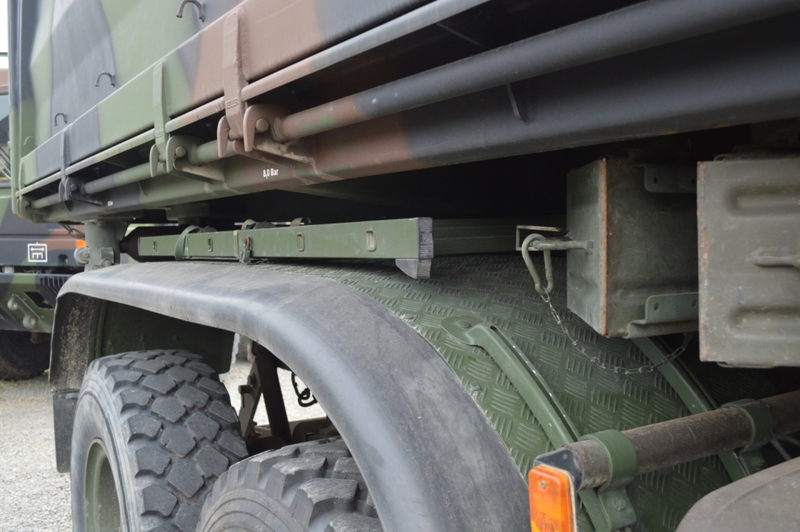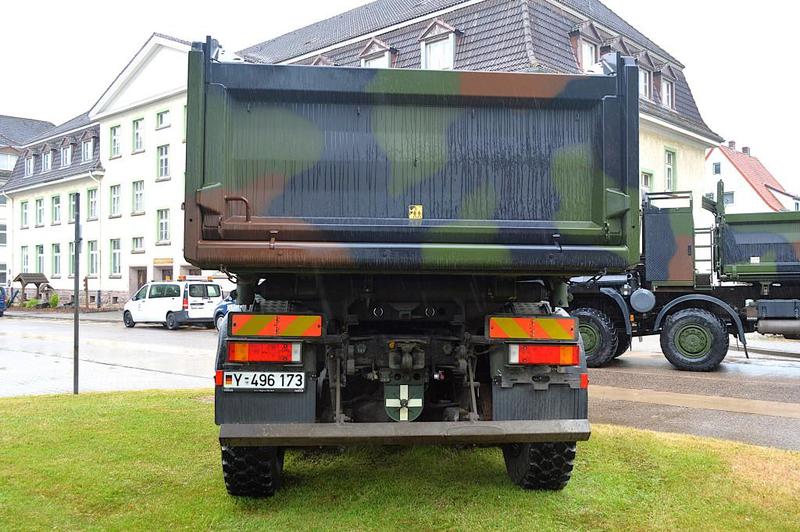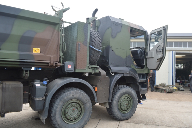 Zum Bau bzw. zur Instandsetzung von Straßen und Plätzen benötigt man in der Regel auch Fahrzeuge die das Baumaterial in loser Schüttung verteilen können. In diese Kategorie fallen auch Dreiseitenkipper! Mit diesen Fahrzeugen kann das Schüttgut (Sand, Kies, Asphalt usw.) neben oder hinter dem Fahrzeug abgeladen werden. Wenn man sich fragt wozu die beiden Ketten unterhalb der Pritsche da sind, damit kann man die hintere Schüttöffnung (die Ketten können an der Heckklappe eingehängt werden) begrenzen und das Schüttgut bei langsamer Fahrt gleichmäßig verteilen. Das erspart beim Straßenbau einiges an Zeit und Arbeit. Die speziellen Einsatzanforderungen der BW machen es leider nötig die Fahrzeuge zum Schutz der Besatzung zu panzern.