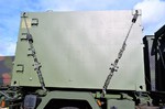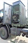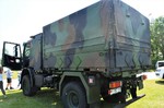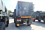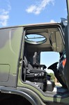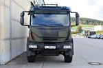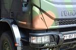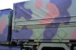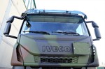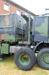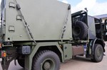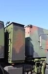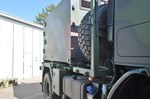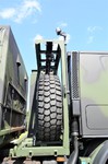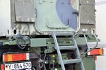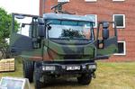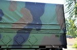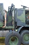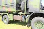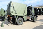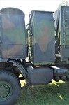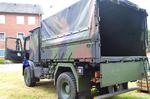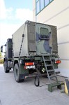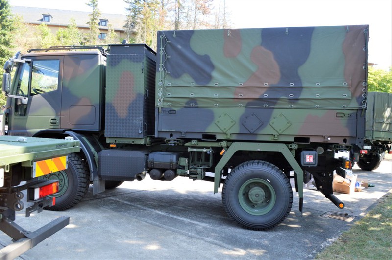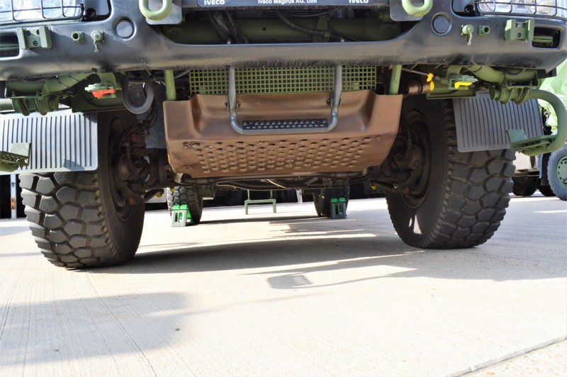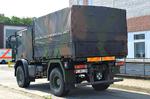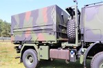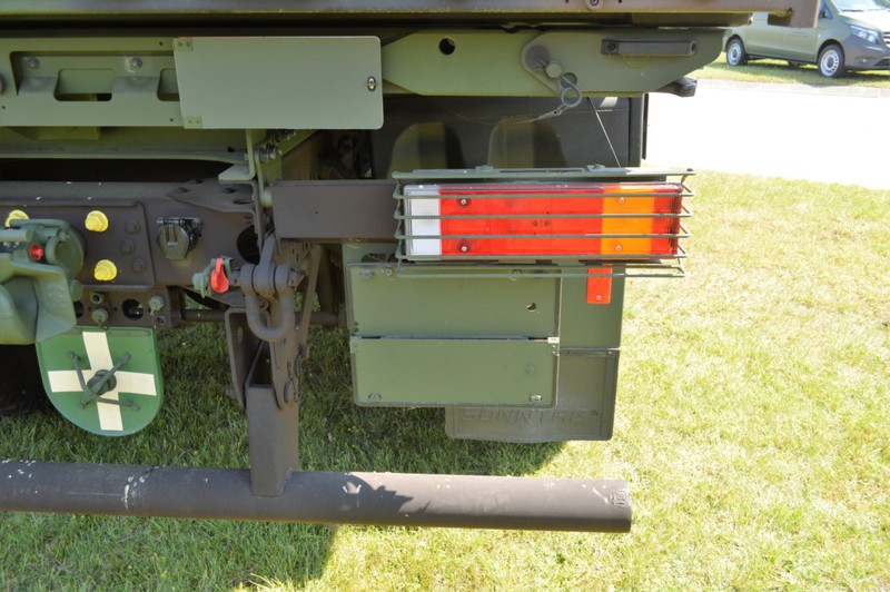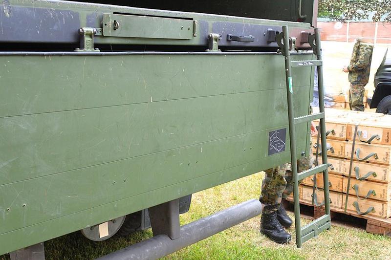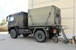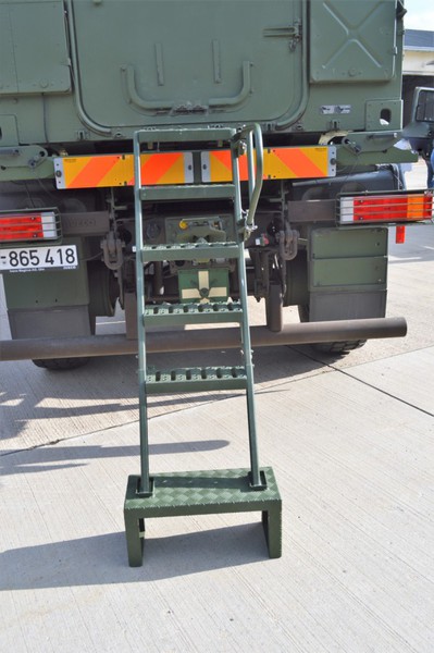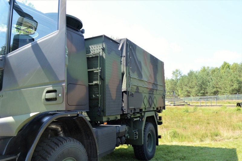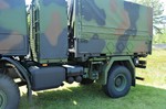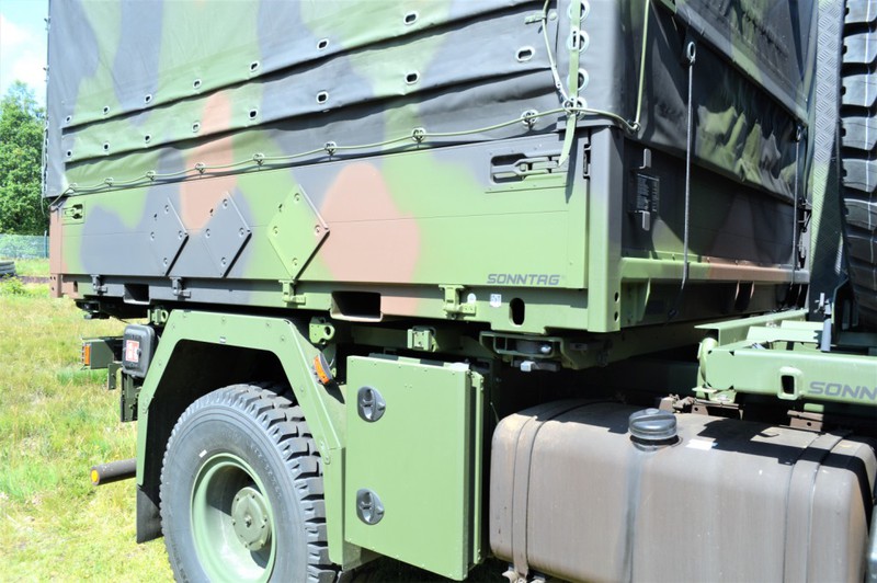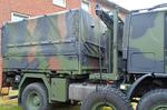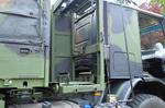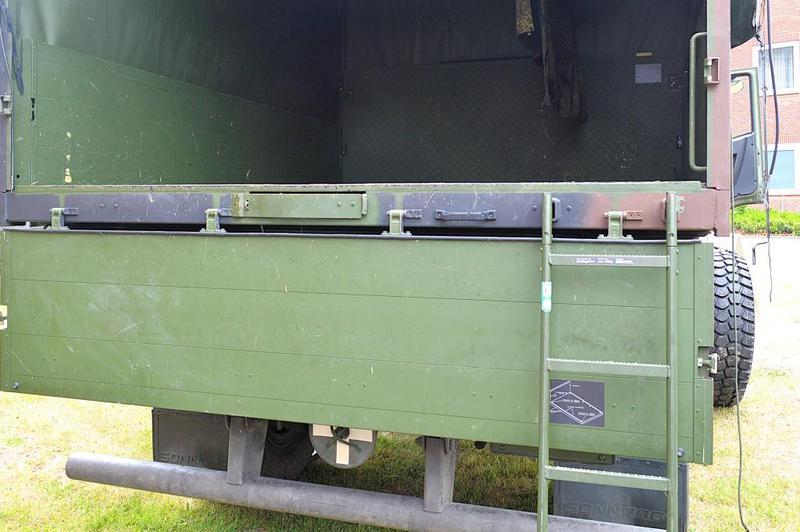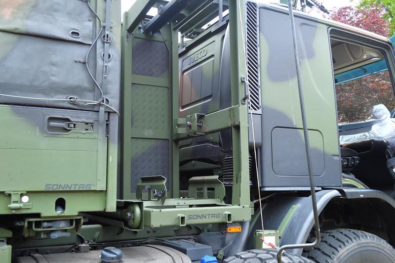 Die folgenden Bilder zeigen einen Wartungstrupp. Der Aufbausetzt sich aus der Palette WSA Wtg Trp 1 und einen zusätzlichen Rahmen zur Aufnahme eines Spriegelgestells. Das Gestell ist in der Höhe verstellbar. Diese Palette wurde auf der Seite Unimog U 5000 schon im Bild vorgestellt. Nachteil dort war die niedrige Plane der Pritsche, durch das neue Gestell wurde eine bequeme Höhe erreicht dass man dort vernünftig im Stehen arbeiten kann. Wer den alten Wartungstrupp auf dem Unimog U1300L kennt, der kennt die gebückte Arbeitshaltung zur Genüge. Die Werkstattausstattung wurde vom alten Fahrzeug auf der Palette WSA Wtg Trp 1 montiert. Erst durch das Twist Look System des IVECO ML 150 und des Unimog U 5023 kann die Palette direkt auf dem jeweiligen Fahrgestell verwendet werden. Die Plattform wird wie die FM Kabine befestigt, hierbei müssen die Twist Looks ebenfalls auf die schmale Position eingestellt werden.