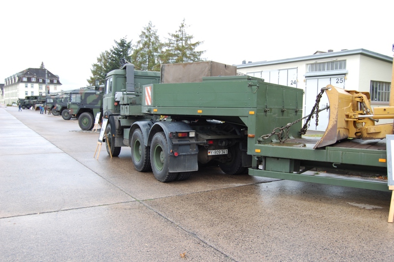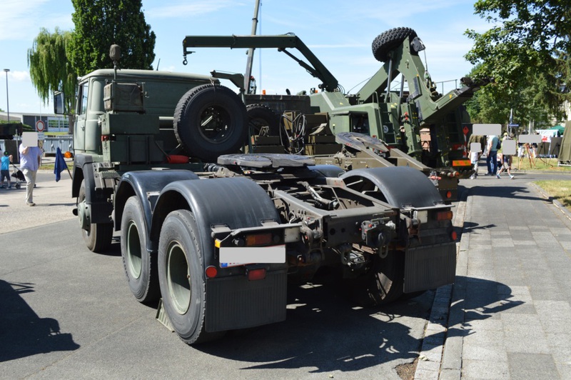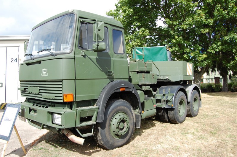 Die Sattelzugmaschine 15t tmil 6x4 so die offizielle Typenbezeichnung. Oder einfach nur Sattelzugmaschine mittel IVECO-MAGIRUS 220-32 AHT diente originär als Zugmittel für die Tanksattelanhänger 24000, Tanksattelanhänger 30000 und den auf dieser Seite gezeigten Tiefladesattelanhänger 25t.