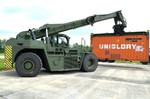 Containerstapler dienen dem Stapeln und Verladen von Containern aller Art. Der Transport von Containern erfolgt im Regelfall durch Schiffe, Lkw´s und Züge. Deshalb kommen Containerstapler hauptsächlich an Orten wie Häfen oder Güterbahnhöfen für den Materialumschlag zum Einsatz. Die Art der Lastenaufnahme eines Containerstaplers unterscheidet sich grundlegend von der aller anderen Gabelstapler. Der Container wird nicht mit einer Hubgabel von unten angehoben, sondern mit einem großen Greifrahmen von oben oder frontal aufgenommen. Dieser Rahmen ist an einem Hubgerüst befestigt und lässt sich an die Maße des Containers anpassen. Um den Container anzuheben, greift der Rahmen in dessen Ecken und fixiert diese anschließend mit Drehbolzen.