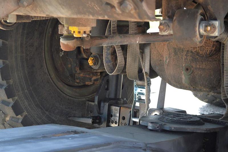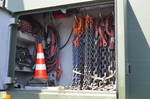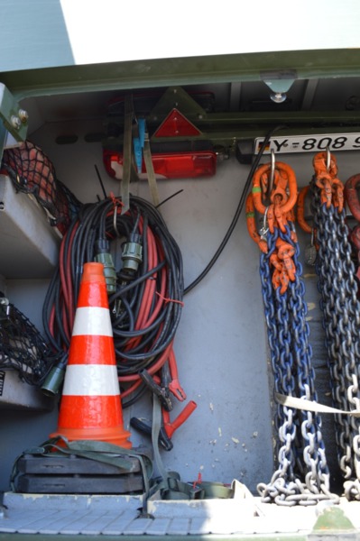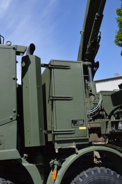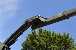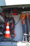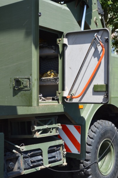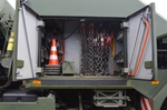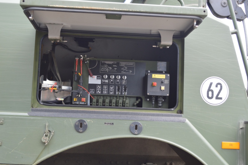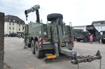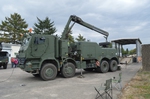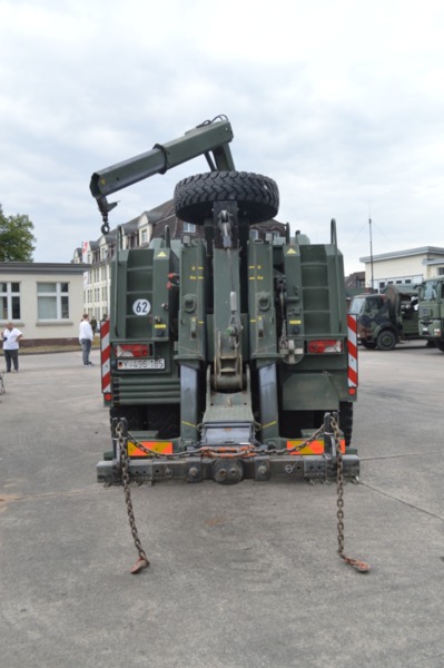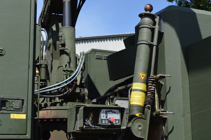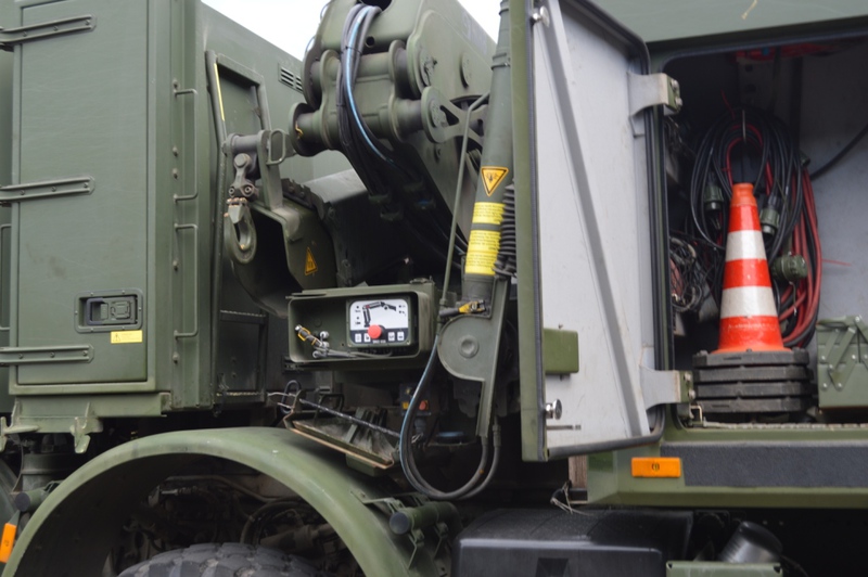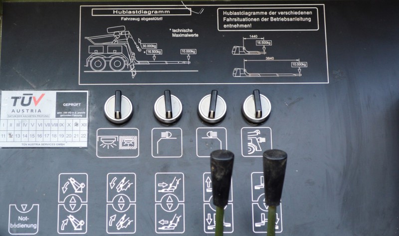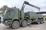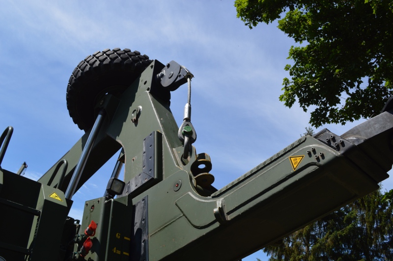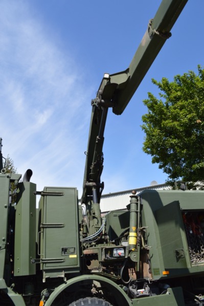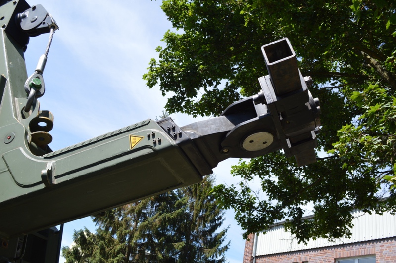 Ladekran mit hydraulischer Schubstück-verlängerung und zweifach teleskopierbarem Knickausleger. Statische Hubkapazität, abgestützt 16 t bei einer Hubhöhe von 5,0 m. Hubbrille bzw. diverse Adapter zur Aufnahme von Schadfahrzeugen |